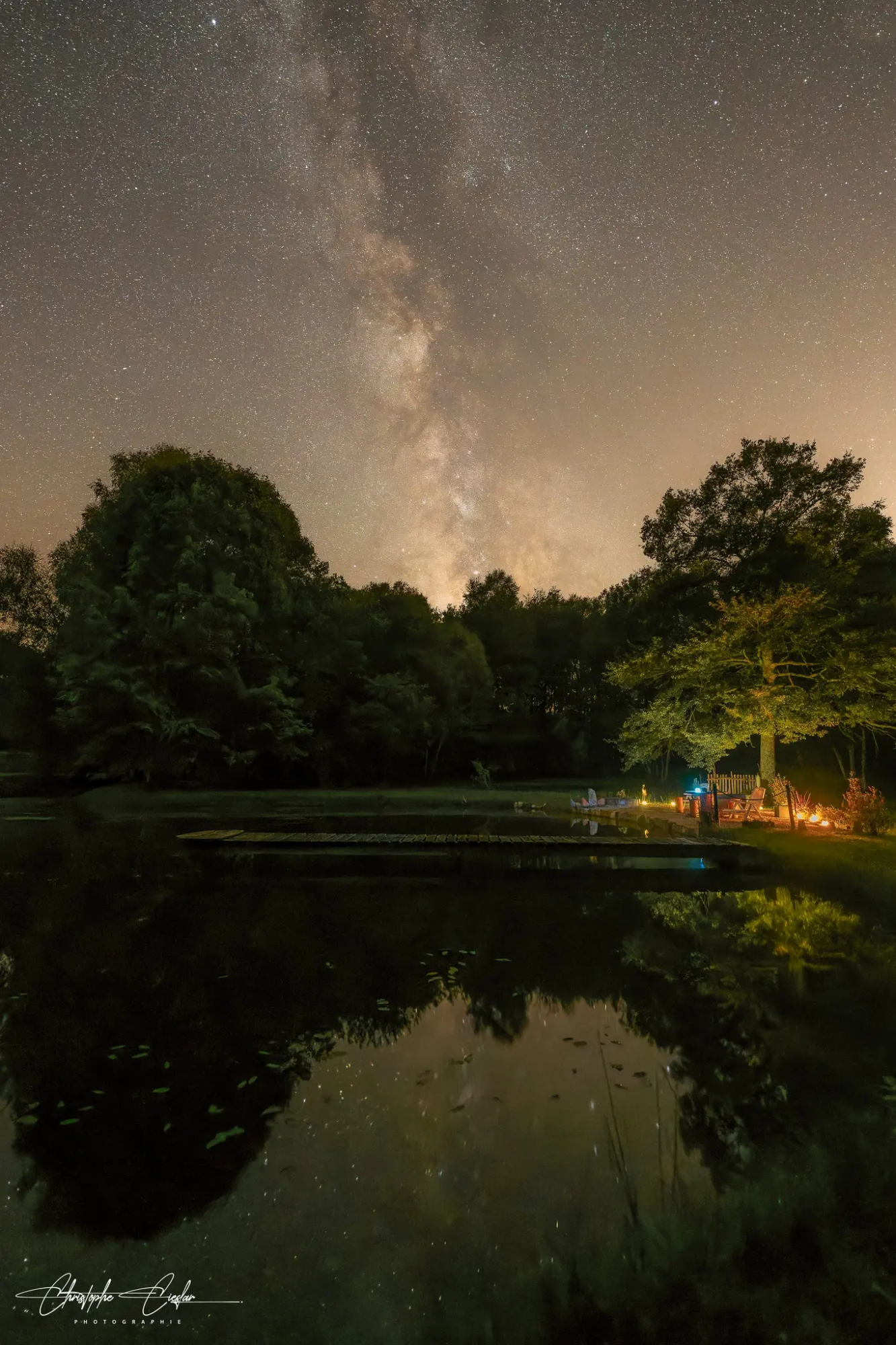 Nous vous accueillons sur une propriété de 3 hectares en pleine nature, traversée par une rivière et où se niche un petit lac. Entouré de bois et de prairies, loin des routes et sans voisins immédiats, le site vous garantit calme et déconnexion. L’accès se fait par un chemin communal non goudronné de 500 mètres.