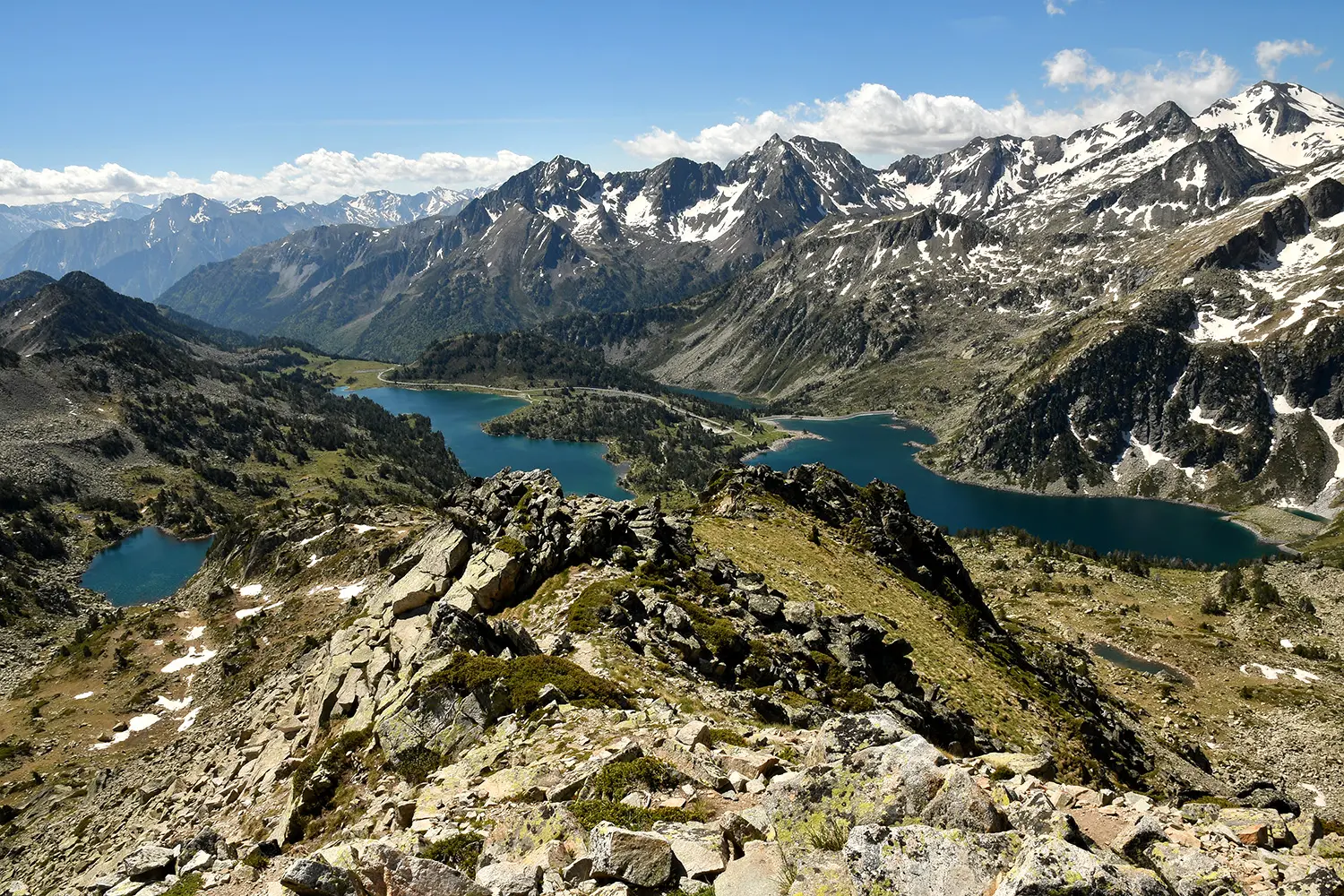 D’est en ouest, les premiers lacs apparaissent dans les vallées de la Carança, avant de s’égrener jusqu’à l’Ibon de Acherito, en vallée d’Hecho, sur le versant espagnol, et jusqu’au lac de Lhurs, blotti dans le cirque de Lescun. Le plus haut d’entre eux culmine à 2 800 mètres, sur l’arête est de la Pique d’Estats, dominant un environnement minéral et austère.
