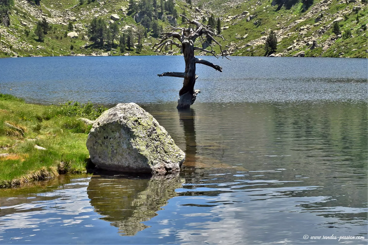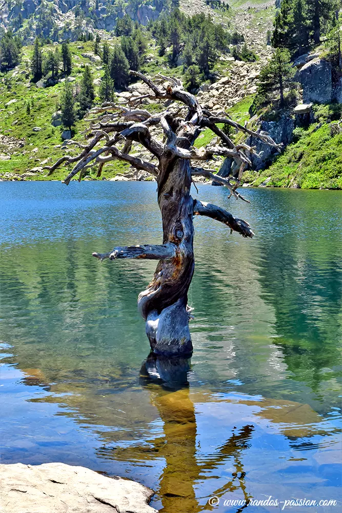Le premier lac que l’on atteint est l’Estany de Baix de Baciver, perché à 2 150 mètres d’altitude. Ses rives sont marquées par un élément insolite : un vieux pin squelettique, à demi immergé, dont les branches décharnées semblent surgir des profondeurs. Avec son allure de créature pétrifiée, il ajoute une touche mystérieuse au décor, comme une légende figée dans le temps.
