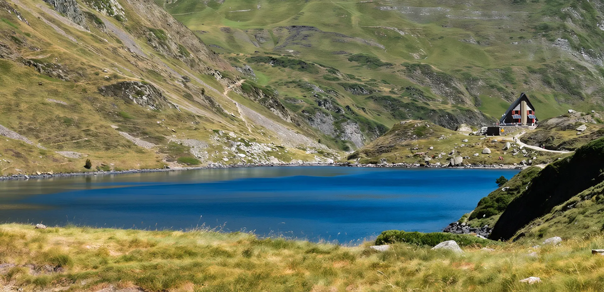 Le refuge d’Ilhéou, posé sur la berge, offre une halte bienvenue pour les randonneurs. Le site est accessible depuis le plateau du Cambasque, par un sentier bien marqué qui passe près du lac Noir, petit bassin en contrebas souvent asséché en été.