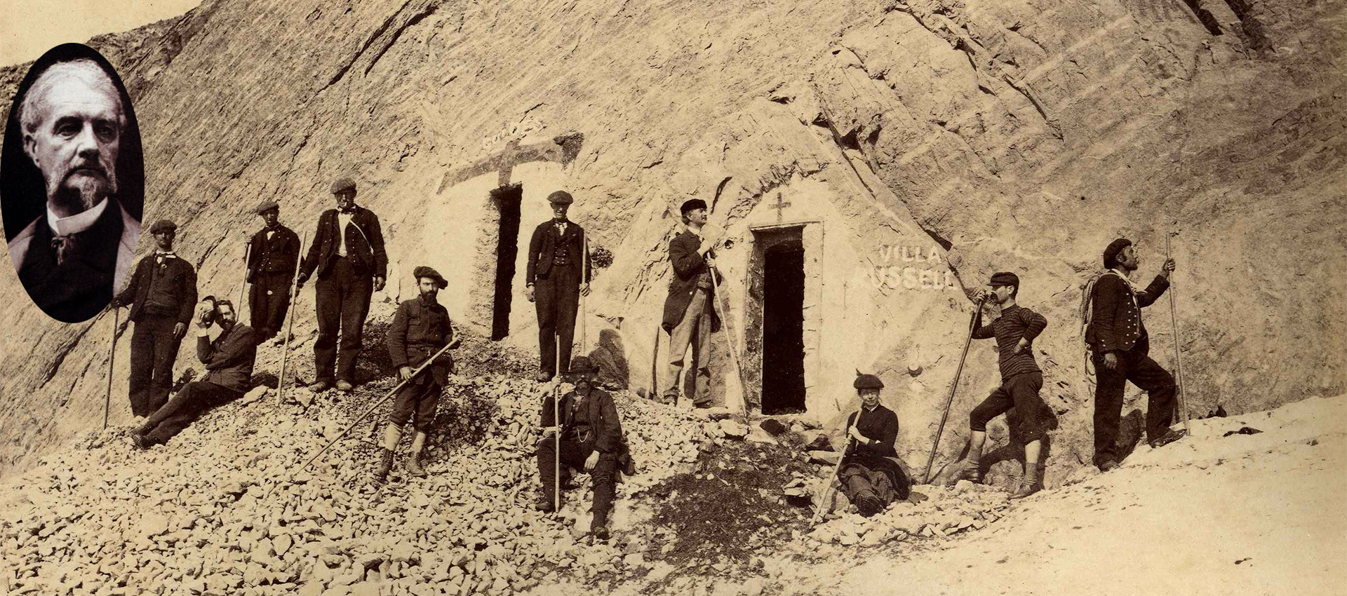 Le comte Henry Russell, inventeur du pyrénéisme d’exploration, effectua dans sa jeunesse de périlleux voyages en Asie, en Océanie et en Himalaya qui inspirèrent Jules Verne. Il se prit ensuite de passion pour le Vignemale, plus haut sommet des Pyrénées françaises, dont il réalisa trente-trois fois l’ascension. Sa notoriété exceptionnelle se transforma en célébrité lorsqu’il décida de consacrer toute sa fortune à percer sept grottes sur cette montagne, à différentes altitudes, en raison des caprices du glacier d’Ossoue. C’est dans ces cavernes que ce solitaire excentrique aimait aussi tenir salon, exacerbant les critiques et les passions ! Celui qui fut surnommé affectueusement » le Fou du Vignemale « obtint en 1889 le droit de régner sur ce sommet prestigieux et son glacier, par un bail de 99 ans consacré par arrêté préfectoral. La légende d’Henry Russell, l’ermite » qui avait épousé une montagne « , était bien née, confortée, il est vrai, par la richesse exceptionnelle de sa personnalité et par son œuvre littéraire…