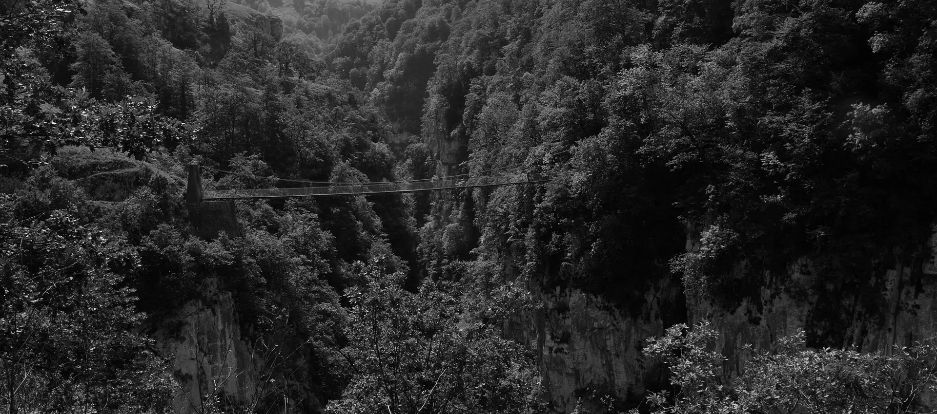 Il fait encore trop sombre pour que nous puissions distinguer le fond des gorges. Toutefois, en martelant nos pas sur les planches de ce pont suspendu, qui oscille, nous « sentons » le vide sous nos pieds : 120 mètres plus bas roule le torrent.